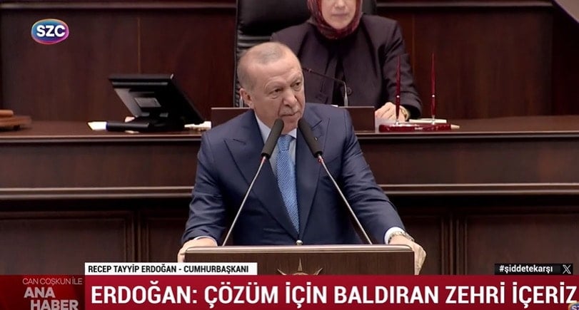 Cumhurbaşkanı Erdoğan Terörsüz Türkiye adı verilen süreçle ilgili grup toplantısında yaptığı konuşmada 2013 yılında ilk çözüm süreci döneminde kullandığı ‘Çözüm için Baldıran Zehri içeriz’ ifadelerini yeniden kullandı.